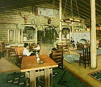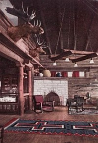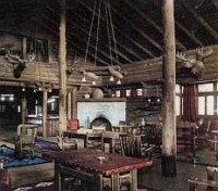 Entering the lobby -- called the Rendezvous Room -- visitors are immediately transfixed by the log panelling, ridgepoles and rafters. Trophy heads adorn the walls above various entryways to gift shops, newsstand, and registration area. The Rendezvous is actually one of the smaller lobbies among the top NPS lodges. It's not that it's cozy either, it's more like the size you'd expect from a railroad hotel. The Rendezvous wasn't designed with lounging in mind; that was intended for the octagonal balcony above, and for other rooms in the hotel such as the original music room. The Rendezvous is used for lounging despite the fact that it doesn't seem suited for this purpose. The lobby balcony is better suited, but is only open to registered guests.