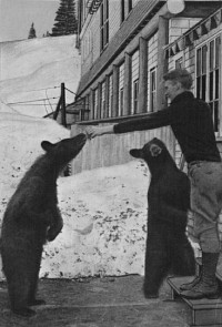 This image circa 1930 doesn't show much of the Lodge, but what little it does reveals a hodge-podge rear structure, not nearly as appealing as the front side. Bear feeding was a popular daily event at the time.